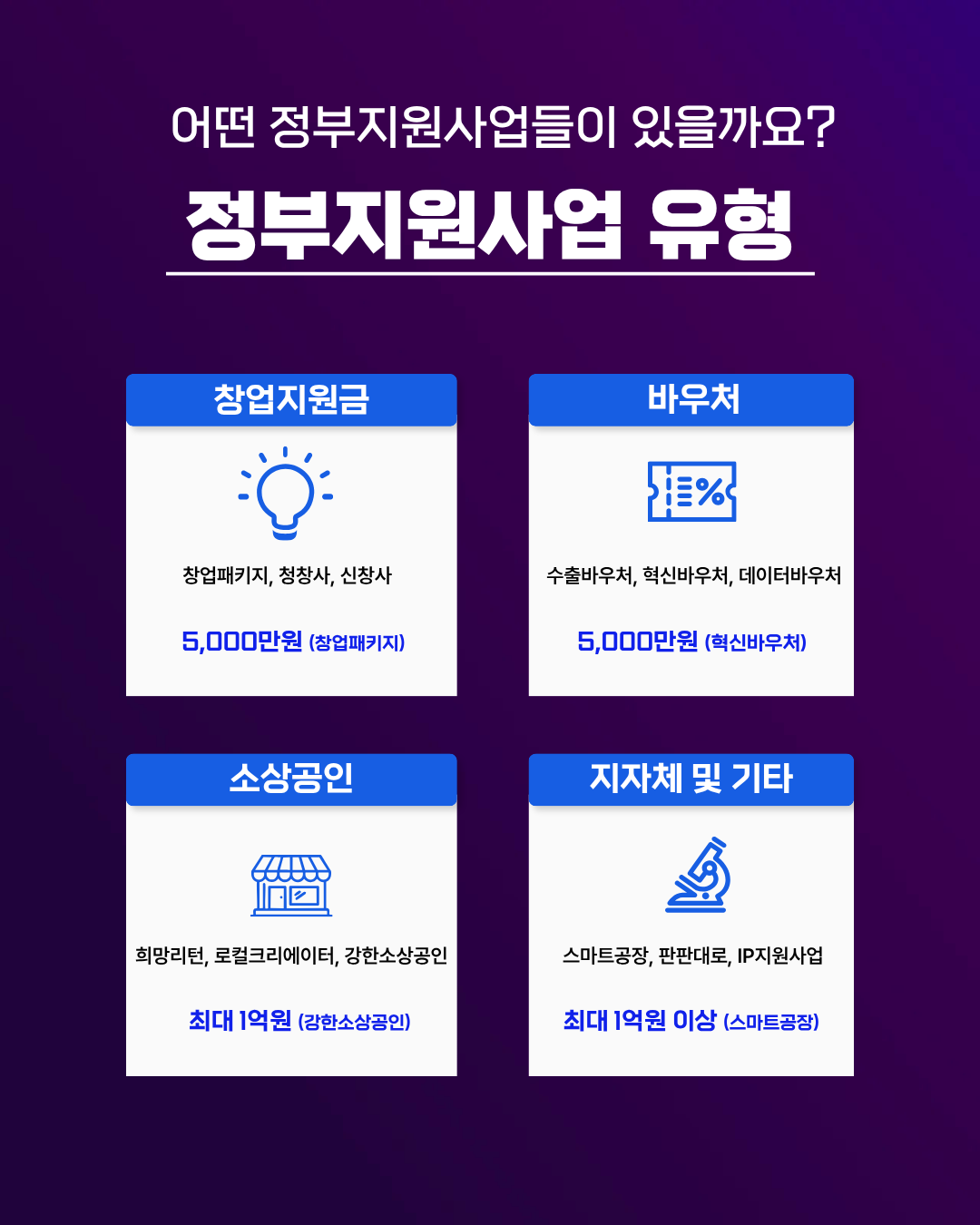 창업지원금 + 소상공인지원금 + 바우처 + 지자체 지원사업 소개